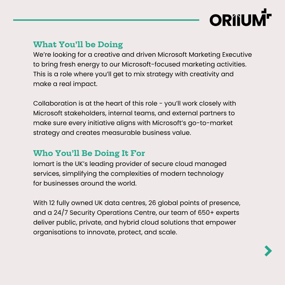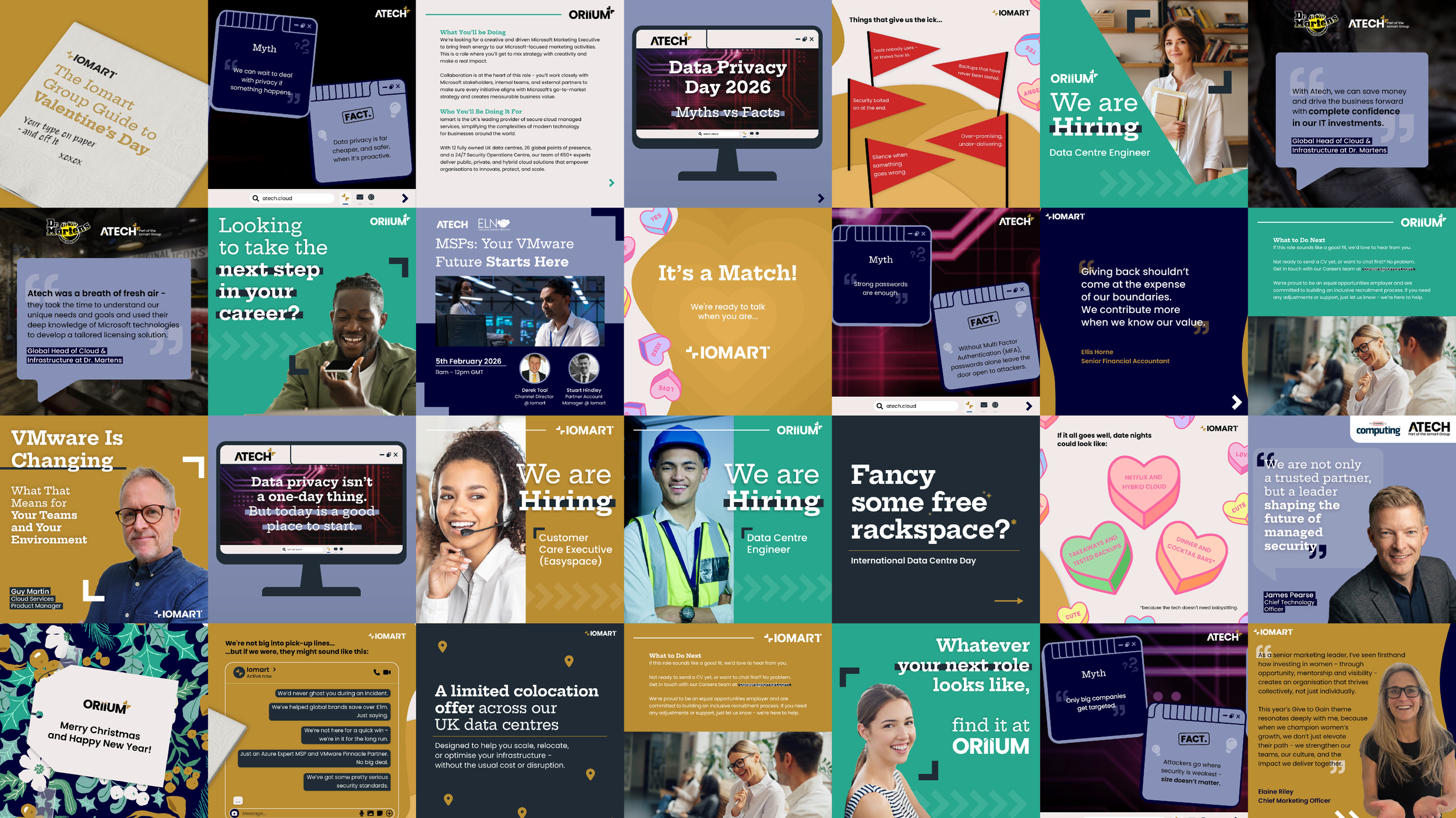 In my role, I work closely with the Digital Marketing Manager to produce a varied collection of social assets for the Iomart Group’s three LinkedIn channels- Iomart, Atech, and Oriium. With the brands now operating under one unified group identity, it was important to create assets that felt aligned while still giving each company its own sense of individuality. To do this, I introduced a structure where each brand uses its own primary accent colour from their shared palette. This keeps the brands distinguishable at a glance while maintaining overall cohesion.